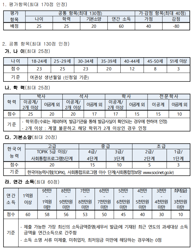 F-2-7 점수제 거주 비자는 총 득점 80점 요건만 맞추면 지원이 가능하기 때문에, 한국어 능력이나 사회통합프로그램 KIIP을 이수하지 않아도 지원이 가능합니다. 소득 부분의 배점이 높아서 소득이 높은 사람이 유리합니다. 연봉 4천만원 이상이면 체류 기간에 상관없이 바로 지원이 가능합니다. 한국 대학 졸업자나 세계 500대 대학에 포함되는 고학력자도 유리합니다.